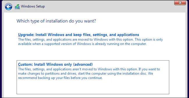 …make sure to select “Custom: Install windows only”, and then select the drive item that matches amount of space you’ve previously freed