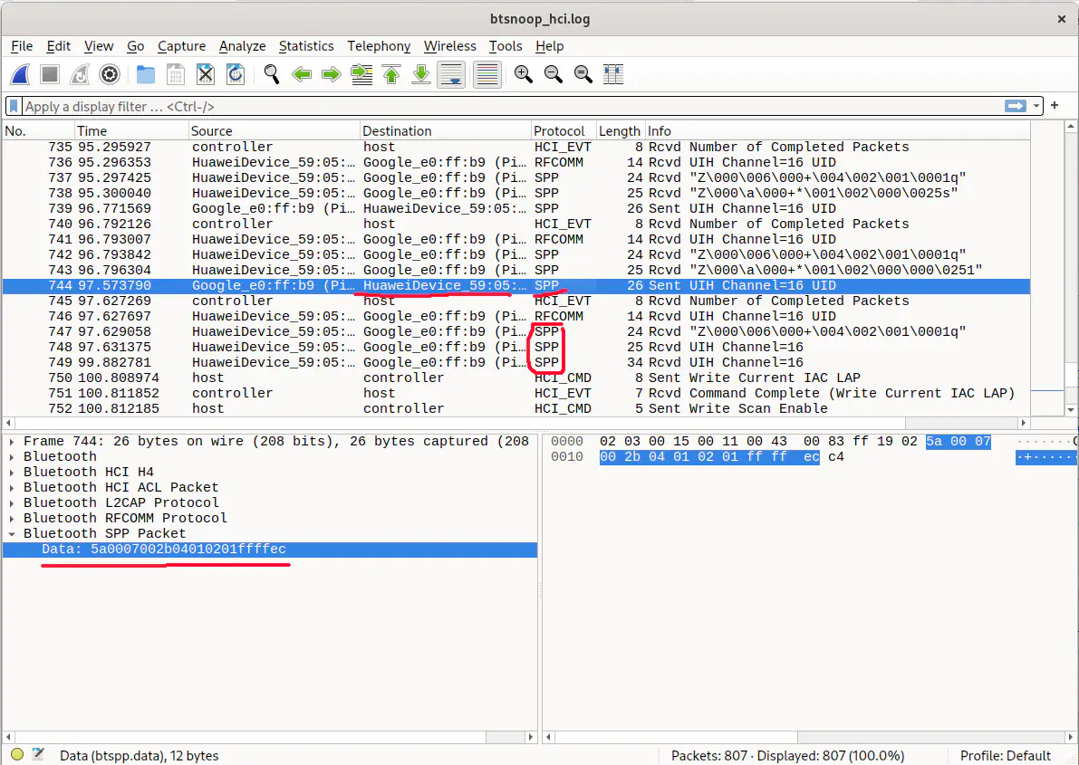 Wireshark shows you everything - every little bit and byte that was sent - stuff that interests us (at least in Bluetooth Classic case) are SPP commands