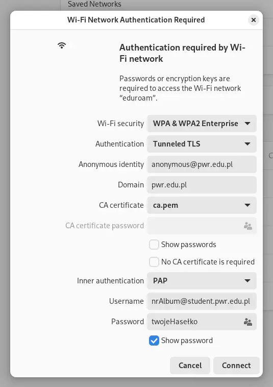 Eduroam korzysta z jakiegoś fiku miku enterprise systemu, gdzie potrzeba mieć fikuśny certyfikat. Kliknij sobie tu żeby go pobrać ⭐ . W dodatku (przynajmniej ten na PWr’ze) korzysta ze 🎉starego🎉 TLS, który jest już wyłączony domyślnie w Linuxach - włączymy go spowrotem 👍